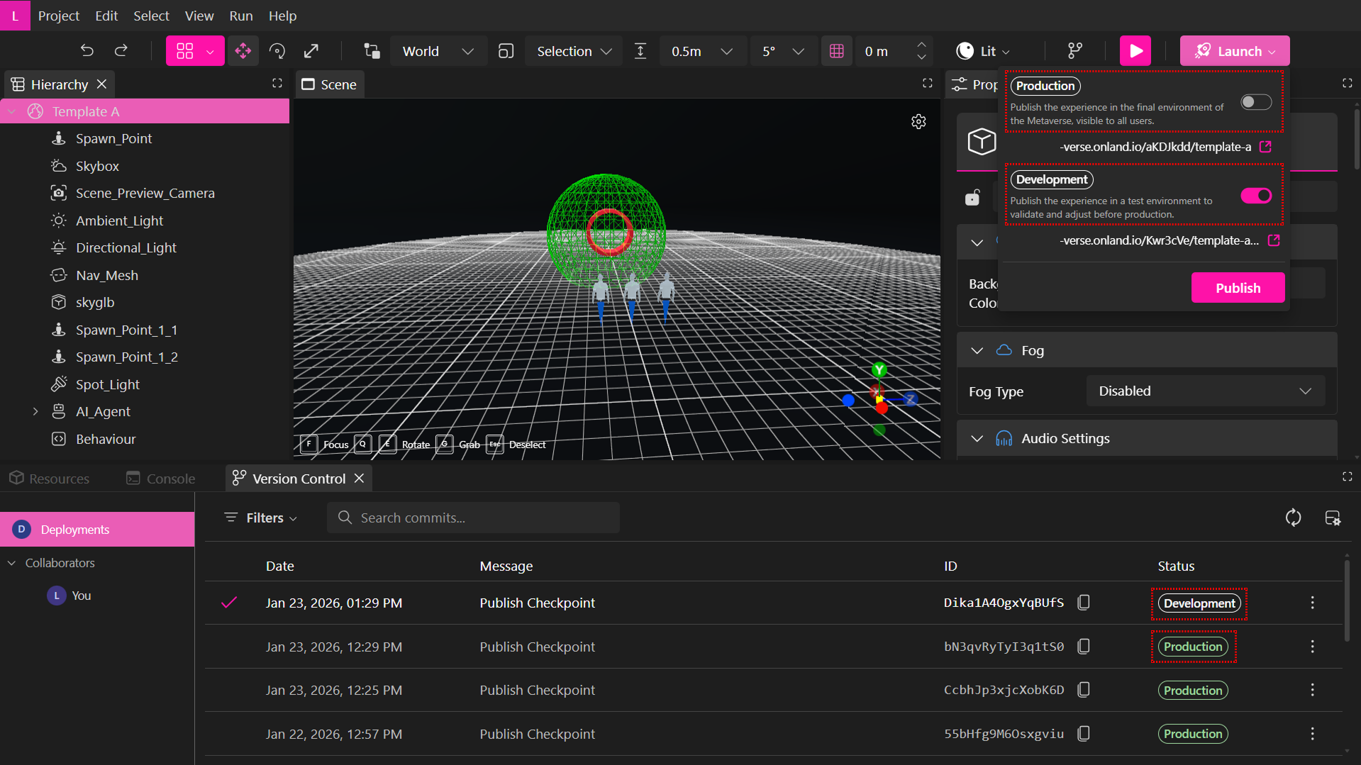 - Production — Publica la experiencia en el Metaverso en vivo, visible para todos los usuarios. La pestaña Verses siempre refleja la versión actualmente desplegada en Producción.